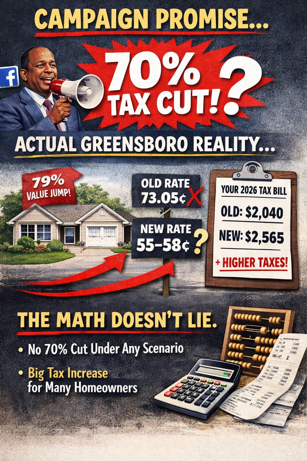 As property owners across Greensboro open their revaluation notices, bold campaign promises are gaining traction, including one claim homeowners could see their taxes reduced by as much as 70%.