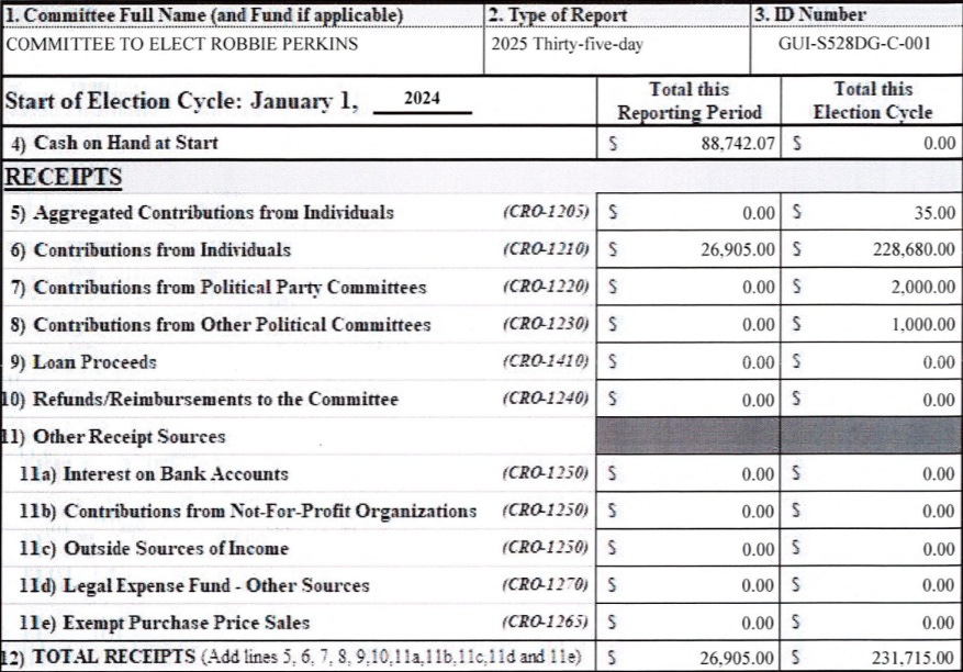 The Perkins campaign is a well-funded operation with high spending and a large cash reserve.