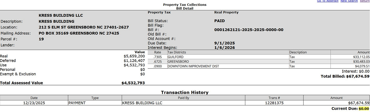 The Kress was assessed at $5,659,200 with $1,126,407 “Deferred” as of 2025;