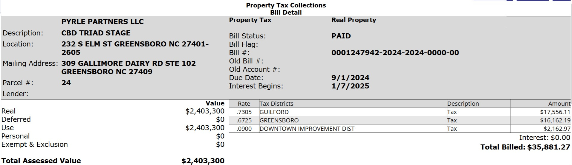 The building at 232 S. Elm, now called the Pyrle Theatre, housed Triad Stage for nearly 20 years. Arthur Samet, Will Stewart, Durant Bell, Jeff Yetter and Daniel McCoy purchased the building in January 2024 for $1.35 million at auction, which was assessed at $2,403,300 in 2024;