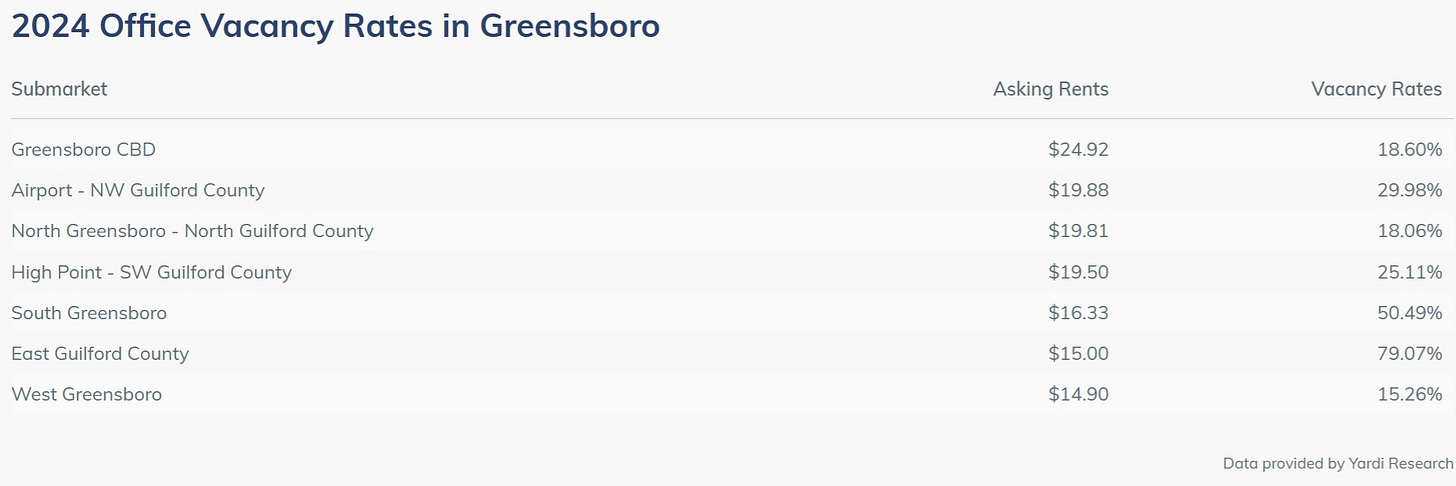 As both the Pyrle and Kress are in downtown Greensboro, with the second highest asking prices for rent and the second lowest stated vacancy rates as of 2024, the rest of the county minus West Greensboro may take a big hit within revaluations.