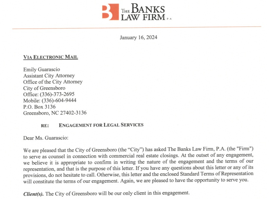 Today, the City of Greensboro wrote "In response to your public records request concerning copies of all records, contracts, communications, invoices, memos, correspondence, and other materials related to the following payments made by the City of Greensboro to The Banks Law Firm, P.A., the Greensboro Legislative Department provides twelve contracts and responds, “The Legislative Department has no additional records responsive to this request.”