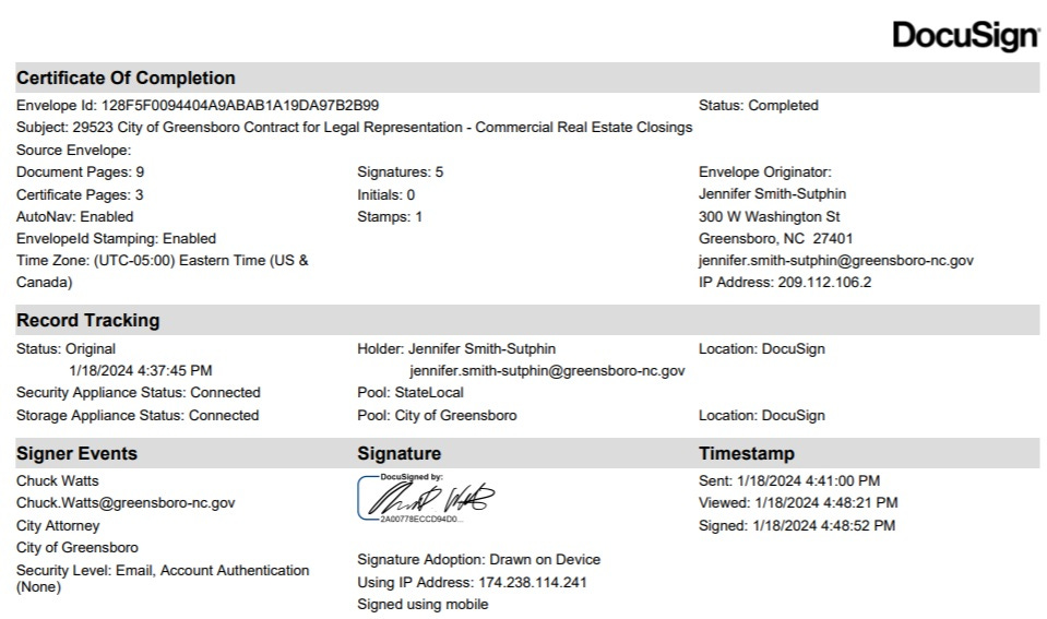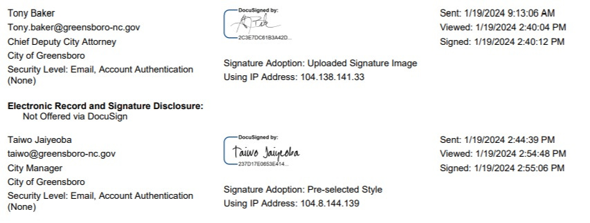 In July 2025, the City of Greensboro terminated two female legal department employees, Jennifer Smith-Sutphin and Shannon Stevens, citing the "mishandling of city resources". Smith-Sutphin sent the Docusign email for one of the contracts above.
