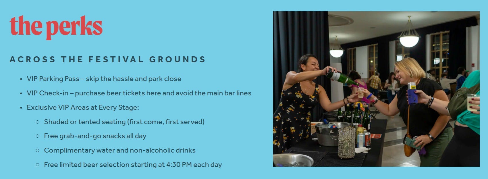 VIP Parking Pass – close-in parking to skip the hassle. VIP Check-in – avoid the main bar lines, purchase beer tickets directly. Exclusive VIP Areas at Every Stage. Shaded or tented seating (first come, first served). Free grab-and-go snacks all day. Complimentary water and non-alcoholic drinks. Free limited beer selection starting at 4:30 PM each day.