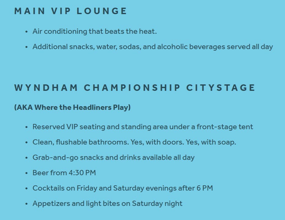 Air-conditioned indoor retreat. Snacks, water, sodas, and alcoholic beverages served all day. Wyndham Championship CityStage (Headliner Stage). Reserved VIP seating and standing area under a front-stage tent. Clean, flushable bathrooms with doors, soap, and running water. Snacks and drinks available all day. Beer starting at 4:30 PM. Cocktails on Friday and Saturday evenings after 6 PM. Appetizers and light bites on Saturday night.