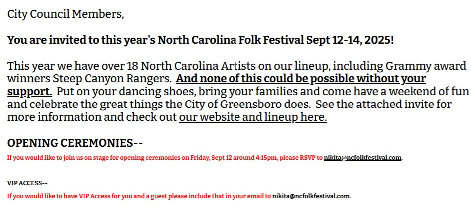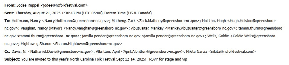 On August 21, 2025, NC Folk Festival Development Director Jodee Ruppel emailed every sitting councilmember, offering complimentary VIP passes for them and a guest: