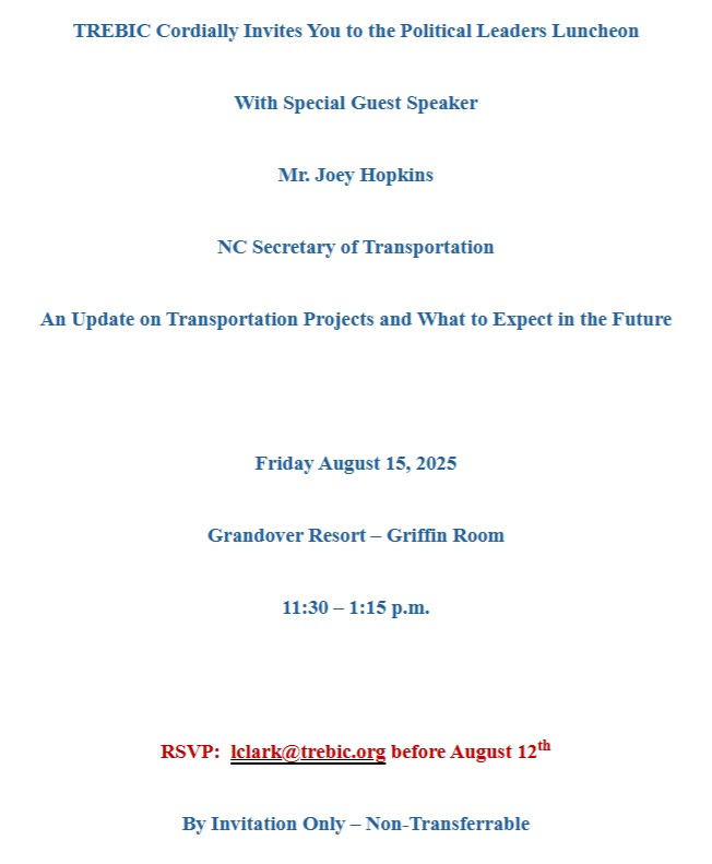 Following the close of Guilford County’s 2025 election registration, TREBIC (the Triad Real Estate and Building Industry Coalition) has invited select political leaders, including incumbent officials and the NC Secretary of Transportation, to an exclusive, invitation-only luncheon at the Grandover Resort on August 15, 2025.