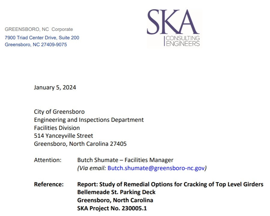 A ten page January, 2024 report by SKA, which does not explicitly recommend demolition of the entire Bellemeade Parking Deck, presented three technically viable remediation options for the specific problem of cracked girders on the top level, with demolition and replacement of only those girders being just one option. The key distinction is between partial demolition (of specific components) and total demolition (of the entire structure) suggested by Samet, which later became the city’s chosen path.