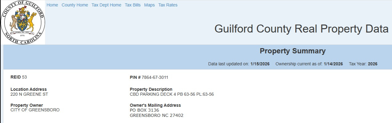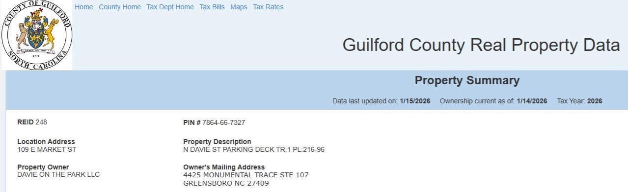 Summer 2025-Winter 2026; The SBI investigation begins, prompted by George Hartzman ethics complaints. The Davie Street sale closes without issue. The Bellemeade sale does not. The most recent property records, current as of January 14, 2026, confirm the city still holds the land at 220 N. Greene Street.