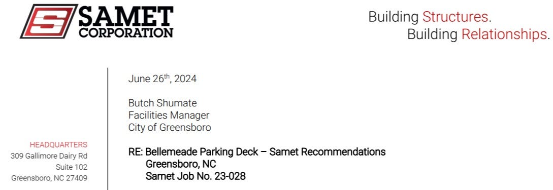 We hope this letter is helpful to the City of Greensboro in deciding the best path forward for the Bellemeade Deck. Samet Corporation is eager to assist in any capacity needed.