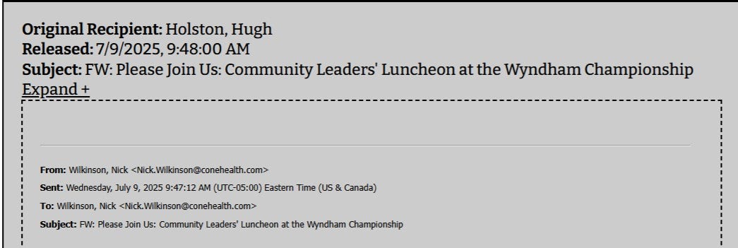Following the close of Guilford County’s 2025 election registration, a pattern of exclusive political hospitality has raised serious ethical and legal questions in Guilford County. Cone Health and the Greensboro Chamber of Commerce are co-hosting a private lunch and golf access at the Wyndham Championship on Friday, August 1, but only for sitting elected officials.