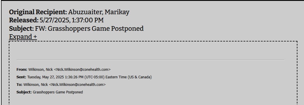 The original date for the Grasshoppers game was postponed. The only Council member who received a rescheduling email that I could find was Marikay Abuzuaiter;