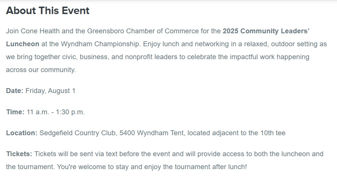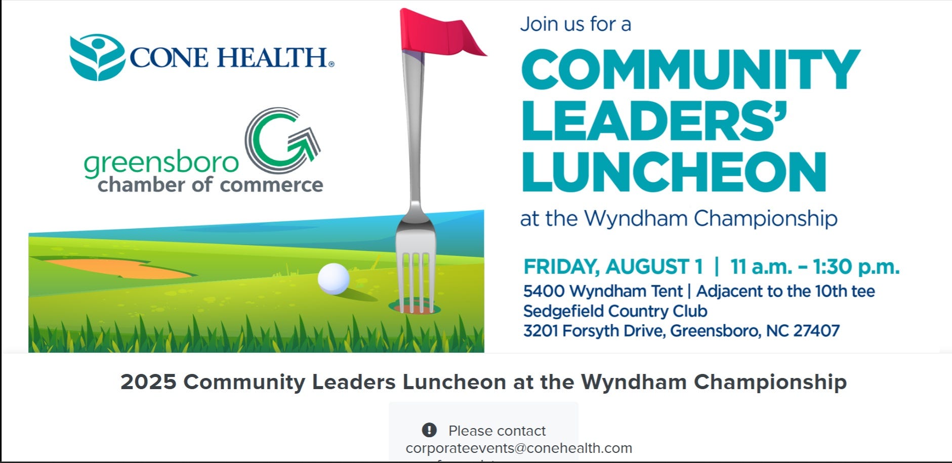 Community Leaders' Luncheon at Wyndham Championship (August 1, 2025) - A private event co-hosted by Cone Health and the Greensboro Chamber of Commerce, including lunch and golf tournament access at Sedgefield Country Club.