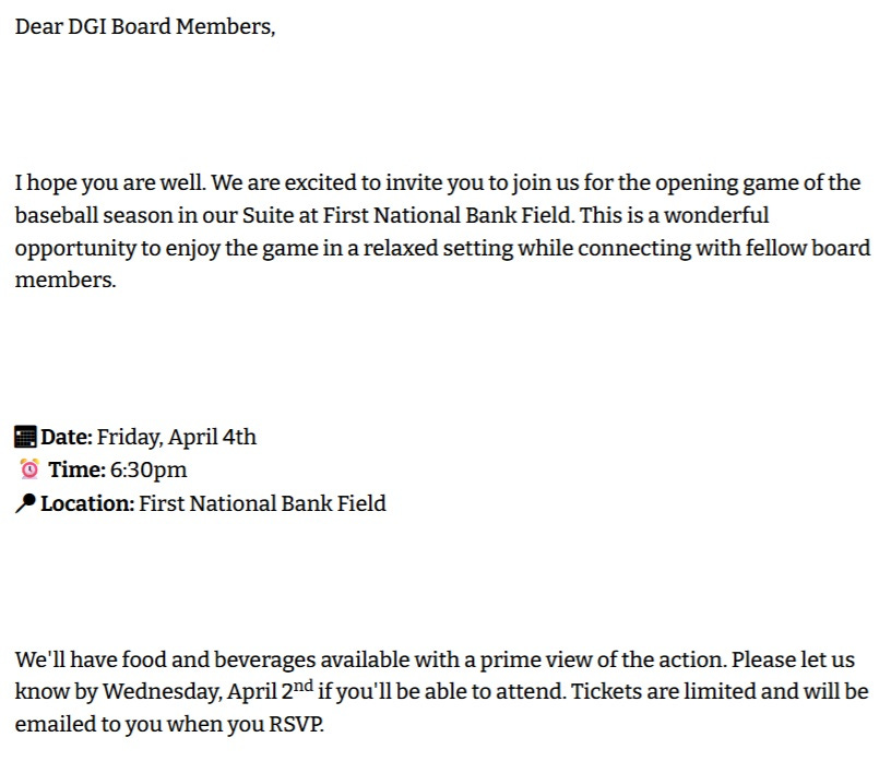 Zack Matheny, CEO of Downtown Greensboro Inc. (DGI) and a Greensboro City Council member, extended invitations to DGI board members on March 26, 2025, for an exclusive suite event at the Greensboro Grasshoppers opening baseball game on Friday, April 4th, at First National Bank Field.