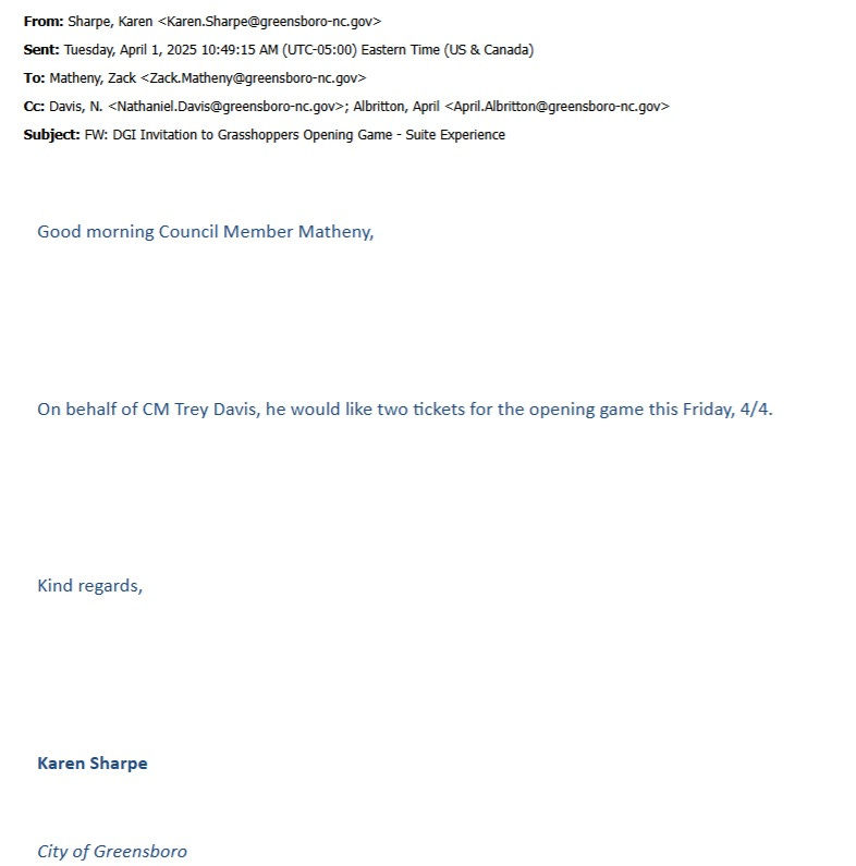 The invitation included food, beverages, and premium seating, funded by DGI, which receives taxpayer money from the City of Greensboro. Davis then asks Karen Sharpe to make it happen;