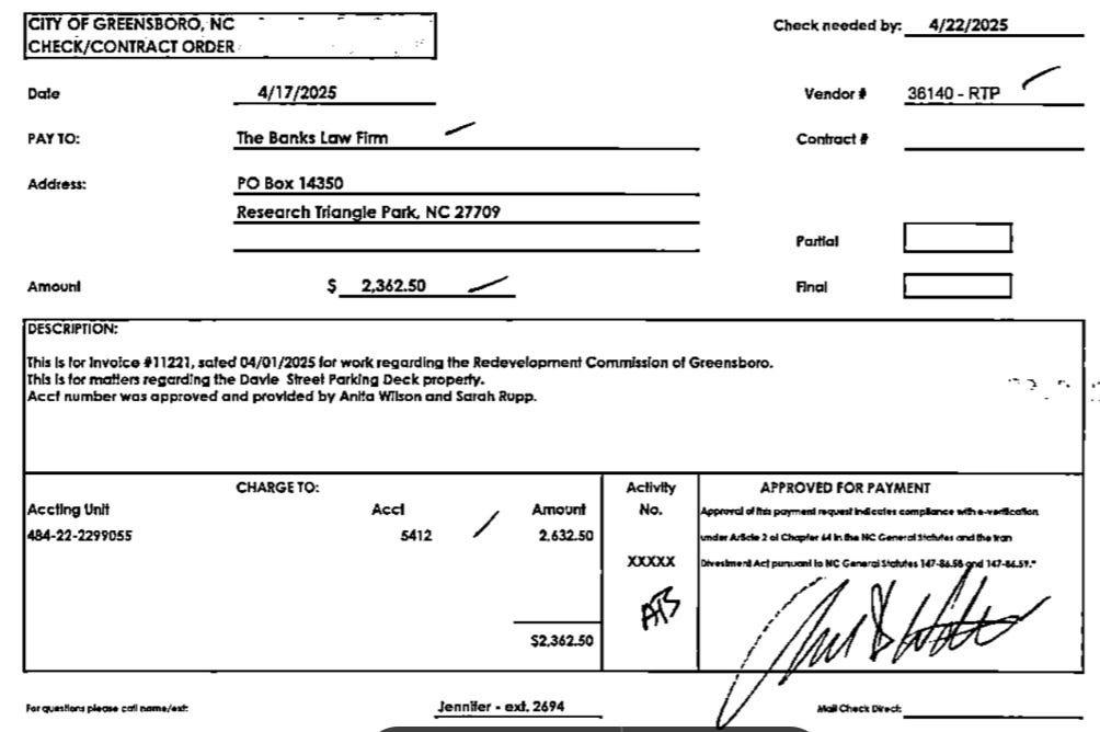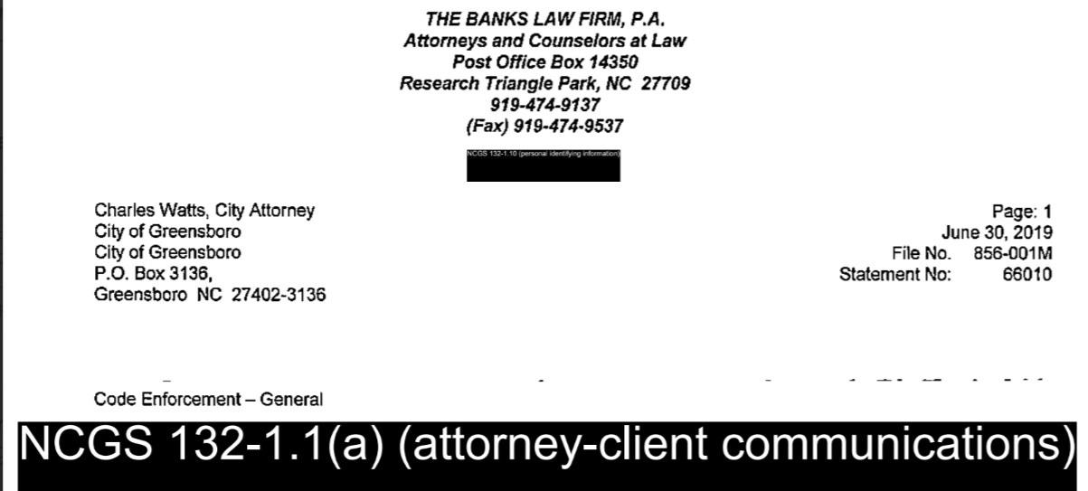 Former City Attorney Chuck Watts authorized payments totaling $681,182.29 to The Banks Law Firm PA, the partnership where he previously worked, during his tenure. It took 190 days (6 months and 6 days) for the The Financial and Administrative Services Department and The City Attorney’s Office at the City of Greensboro to provide the information, much of which is blacked out.