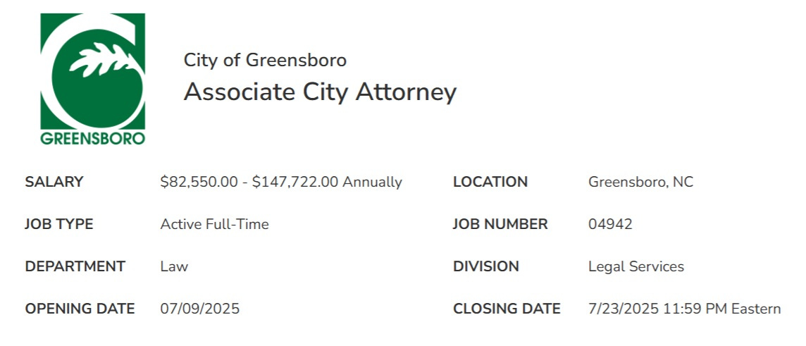 No searches indicate the City of Greensboro posted or advertised a vacancy for the City Attorney position prior to Lora Cubbage’s initial hiring, nor for the City Attorney position before her July 8 appointment. The City’s career archives, press releases and council agendas show no evidence of a competitive recruitment process for either role. The only relevant listings that appear afterward are a July 10, 2025 posting for an Associate City Attorney, apparently to replace Cubbage’s former position, and an August 15, 2025 posting for Deputy City Attorney, which followed Deputy Attorney Tony Baker’s resignation. Together, these records suggest that no public or competitive hiring process occurred before Cubbage’s rapid promotion to lead the legal department.