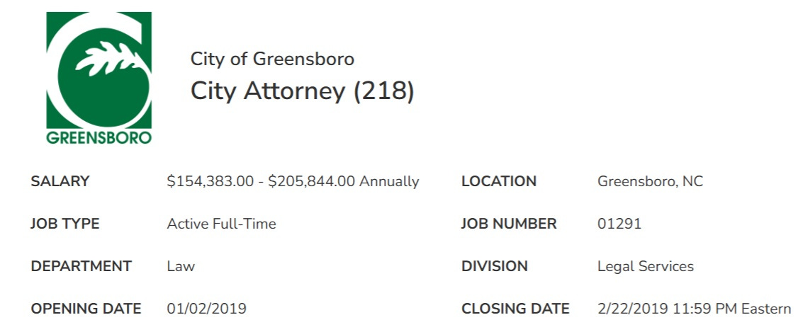 The concerns begin with Greensboro’s own hiring standards. A job posting published the day after Cubbage’s promotion to City Attorney requires “four to six years of experience practicing in municipal law or equivalent legal experience.”