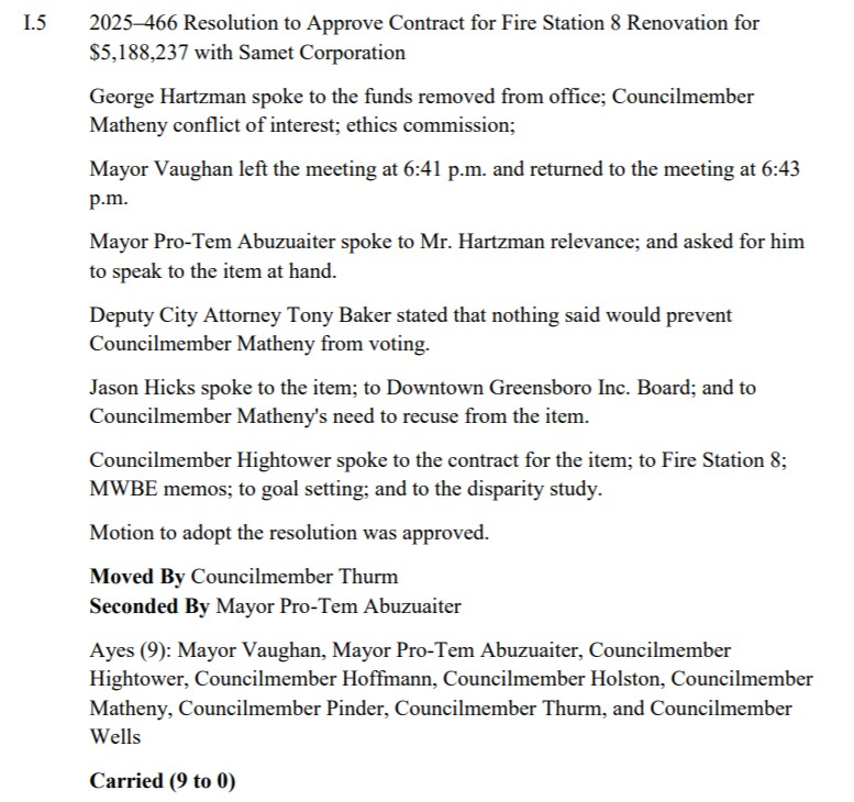 By failing to recuse himself, Matheny undermined public trust, exposed the City to legal and reputational risk, and reinforced perceptions that insider relationships, rather than merit, drive the allocation of taxpayer-funded contracts in Greensboro.