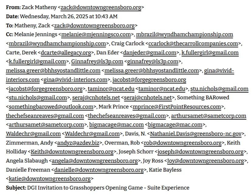 Zack Matheny extended invitations to DGI board members on March 26, 2025, for an exclusive suite event at the Greensboro Grasshoppers opening baseball game on Friday, April 4th, including Arthur Samet. The invitation included food, beverages, and premium seating, funded by DGI, which receives taxpayer money from the City of Greensboro.